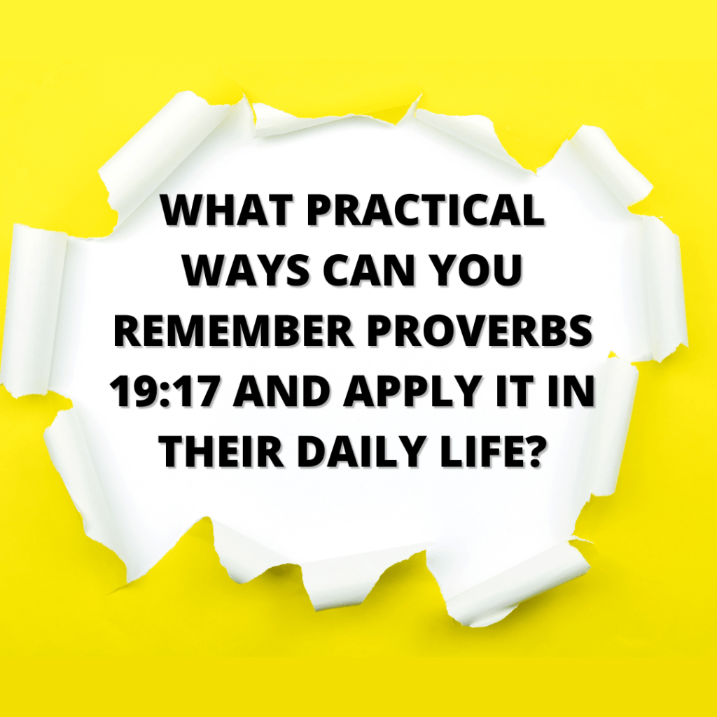 Proverbs 19:17 states, “Whoever is kind to the poor lends to the Lord, and he will reward them for what they have done.” This verse encourages us to be kind to the less fortunate and promises that God will reward us for our kindness. Here are some practical ways to remember this verse and apply it in your daily life: